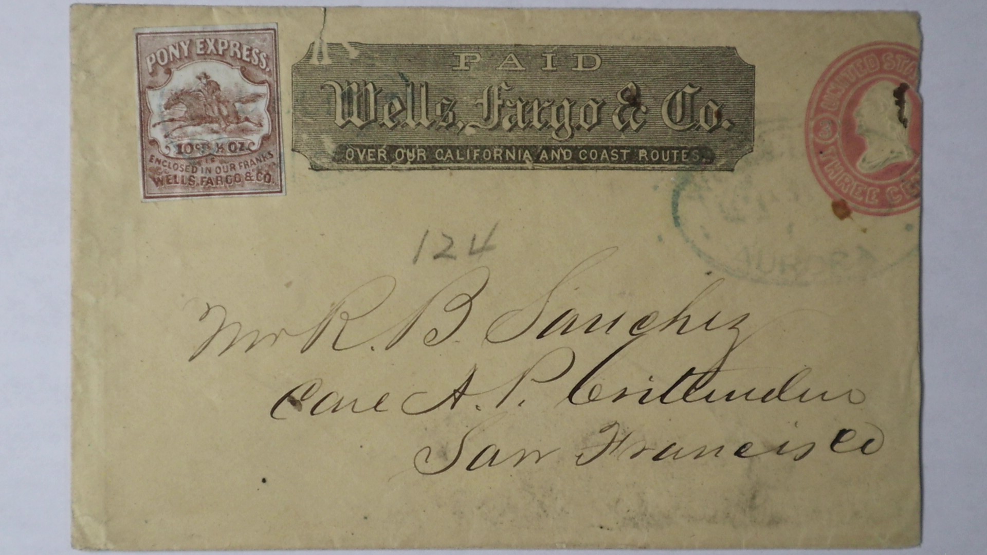 addressed to Mr. R.B. Sanchez care A.P. Crittenden San Francisco. Light cancel blue oval handstamp tying 10c brown clear to large margins on 1861 Wells Fargo & Co. local stamp. 3c pink entire to San Francisco, with second strike canceling indicia, black company frank at top, small tear at top and reduced at right into indicia, with 2016 PF cert. 534667 signed by Larry Lyons.
