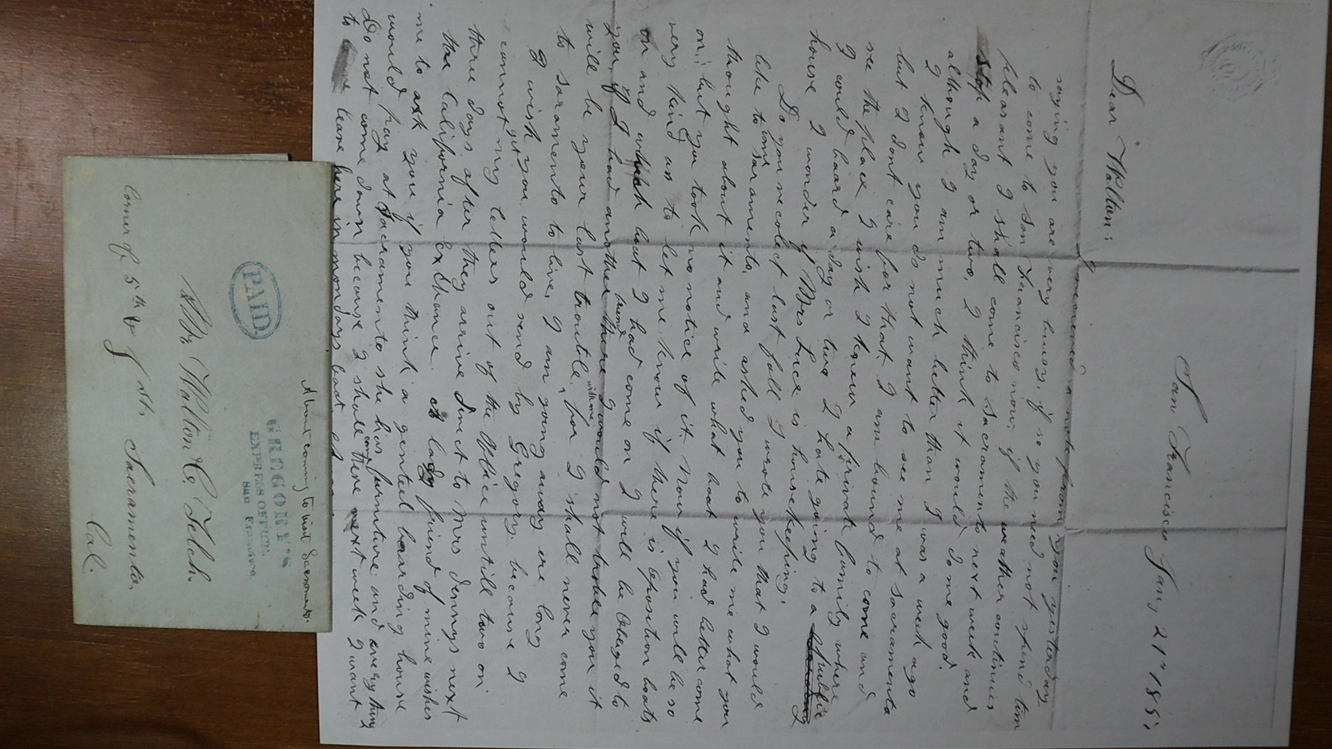Letter addressed to Walton C Felch corner of 5th and J St. Sacramento Cal. Excellent condition.