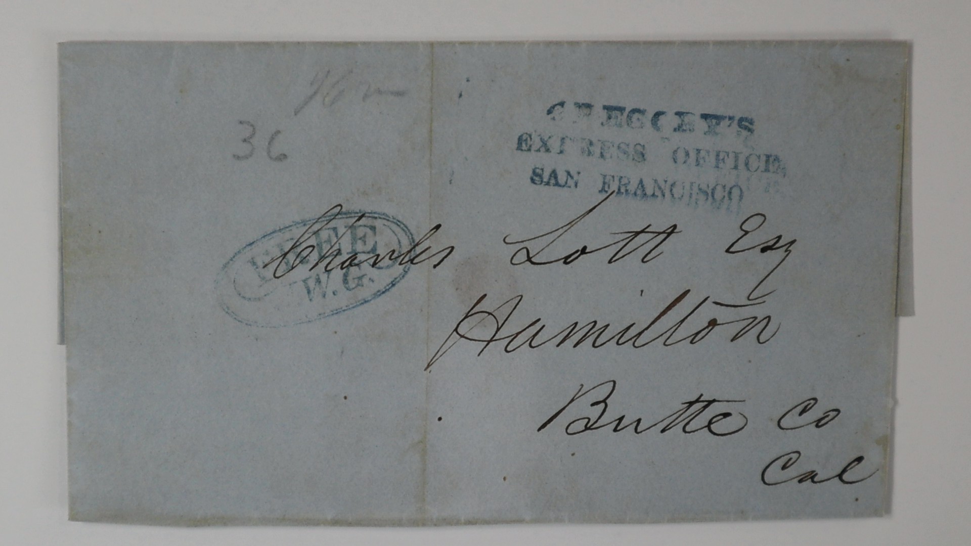 blue three-line company handstamp (GRE-110) with matching blue Free J.W.G.(initials for Joseph Gregory) company oval (GRE-204c) on outer sheet (no letter) to Hamilton, Butte Co., Cal. vertical file fold, missing portion of one backflap. One of only a few known examples of this free handstamp.