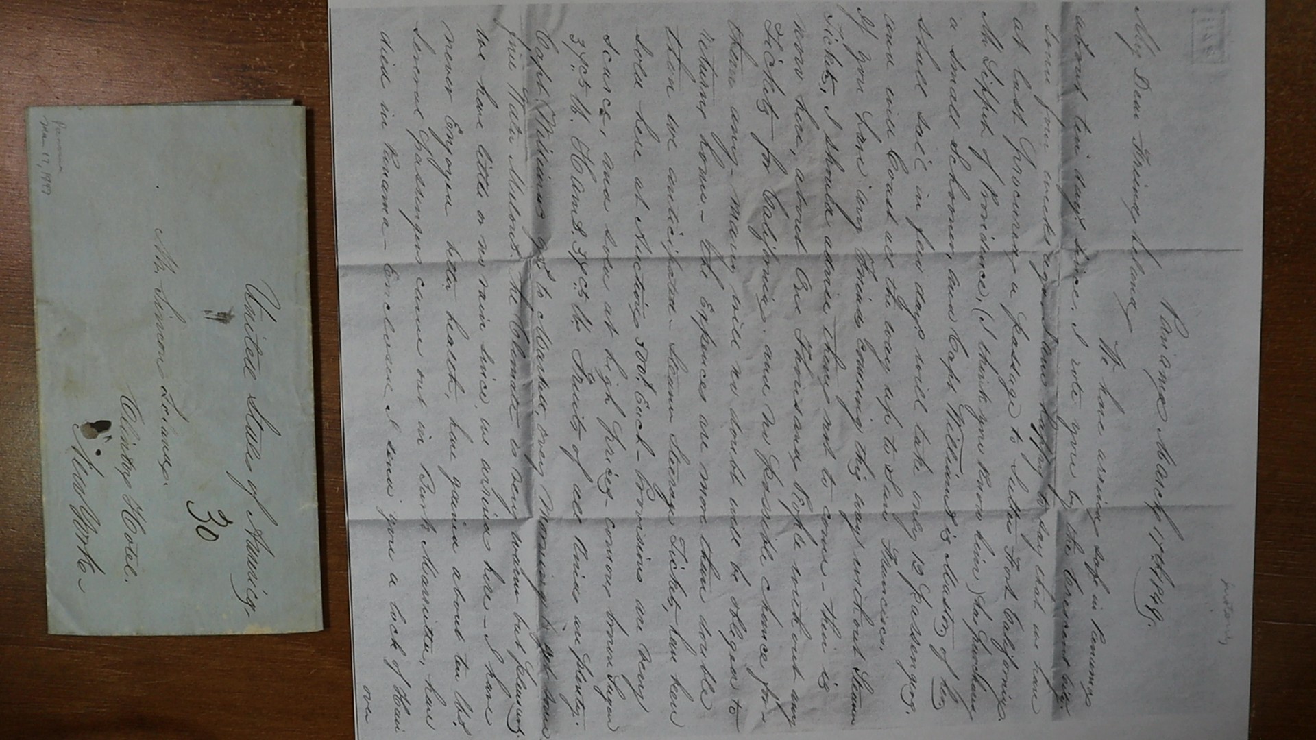 We have arrived safe in Panama about ten days since I wrote you by the (ship) Crescent City , some 4 weeks ago. Im happy to say that we have at last procured a passage to Sutters Fort California. Mr. Lippet of Providence has purchased a small schooner and Capt. Williams is master of her. Shall sail in a few days will take only 12 passengers and will coast all the way up to San Francisco. If you have any friends coming this way without steamer tickets, I should advise them not to come. There is now here about 1000 people without any tickets for California, and no possible chance for them any. Many will no doubt be obliged to return home. The expenses are more than double than we anticipated. Steamer Steerage tickets, have been sold here at auction $500 each. This is the earliest recorded cover to New York with the 30c Steamship rate from Panama.
