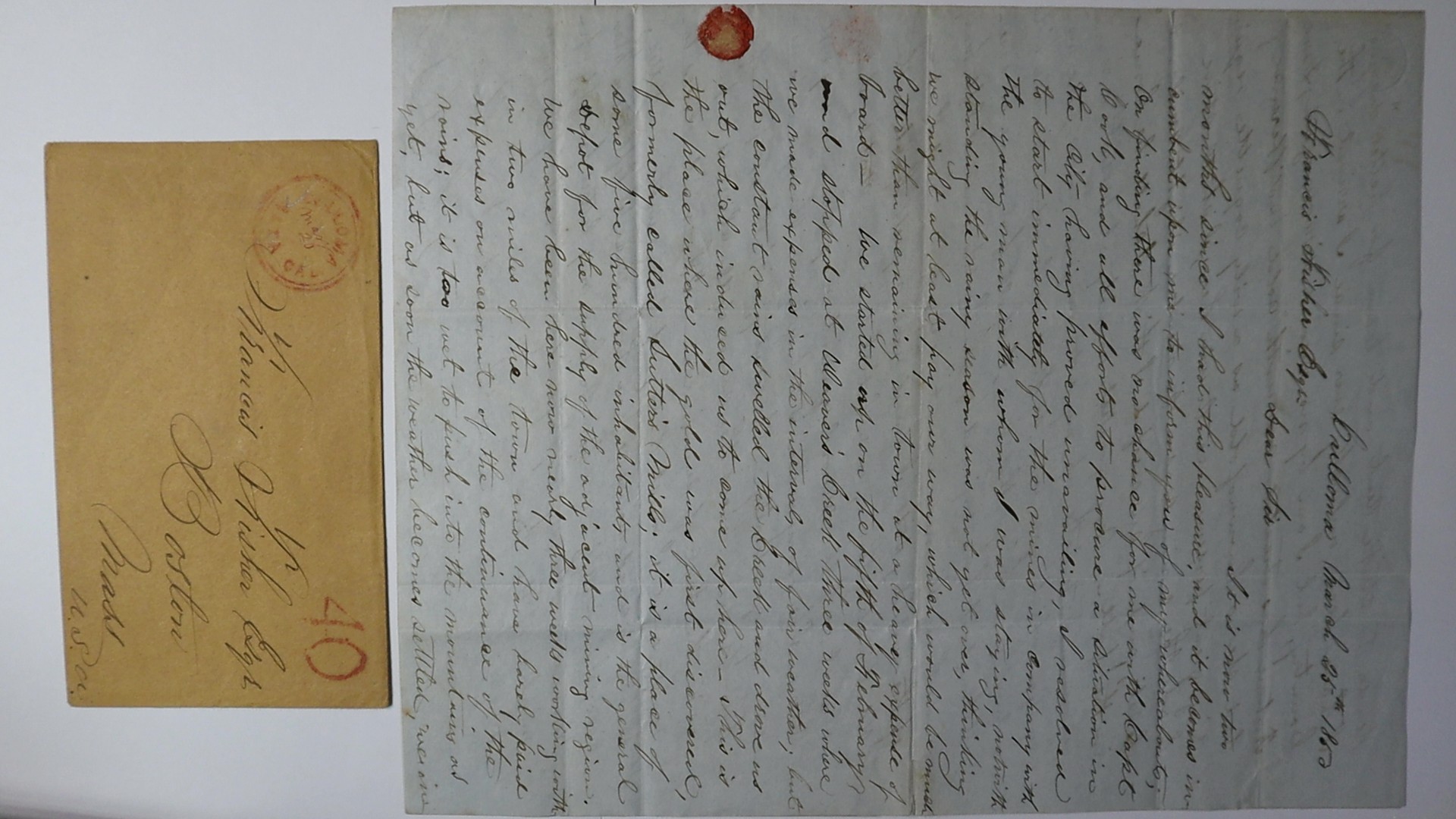 (ELD-400) red double-ring datestamp with magenta manuscript date and red 40 handstamped rating on 1850 cover to Boston Mass. Cover with original miners enclosure included describing the town of Culloma and mining in the area, We started up on the fifth of February and stopped at Weavers Creek three weeks where we made expenses in the intervals of fair weather, but the constant rains swelled the Creek and drove us out, which induced us to come up here - This is the place where the gold was first discovered, formerly called Sutters Mills, it is a place of some five hundred inhabitants and is the general depot for the supply of the adjacent mining region, we intent to strike tent and leave for better diggings.