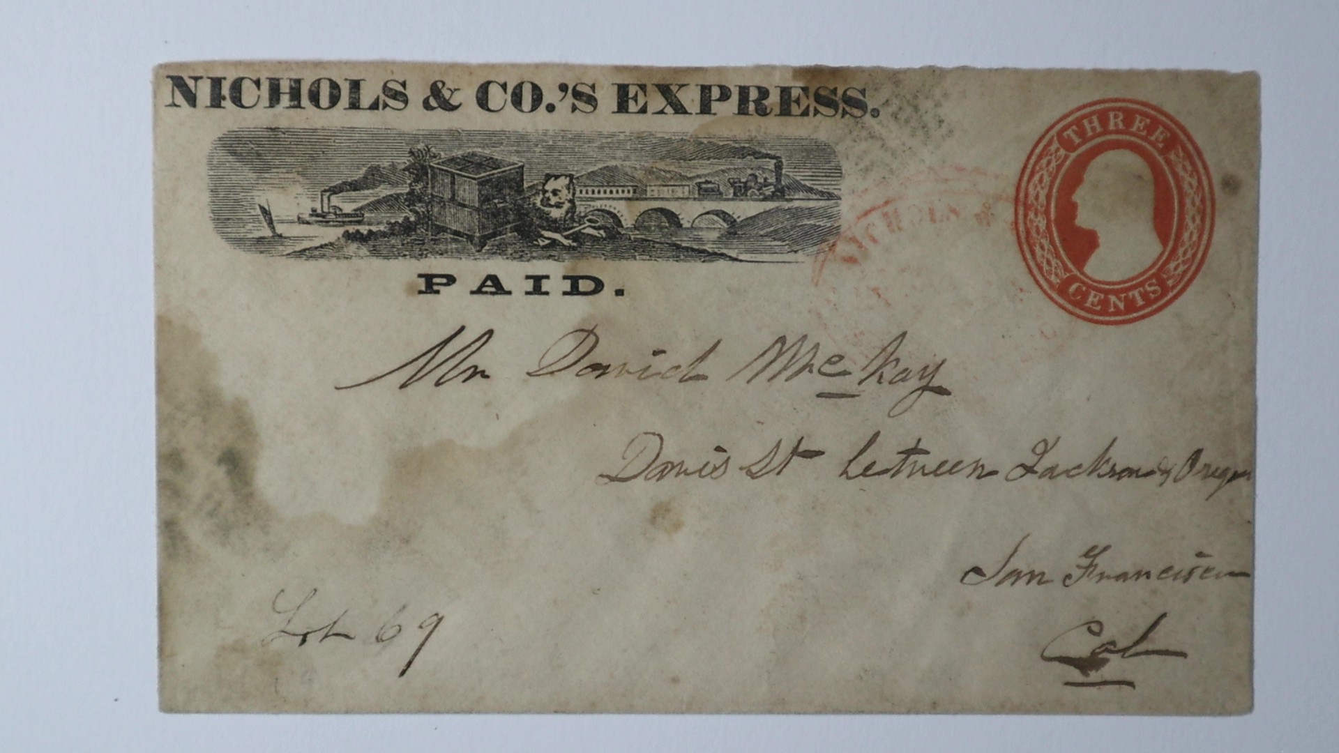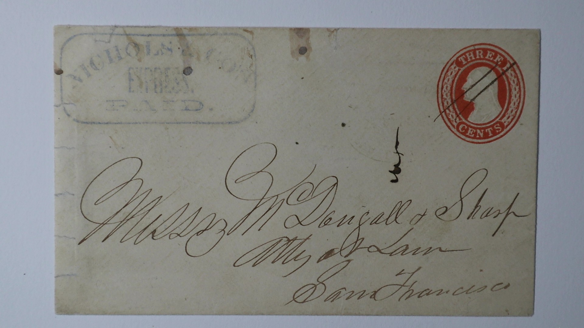 cover has black Nashua N.H. cds with 10 rate handstamp, struck large blue Browns/ Express/Stockton express co. handstamp (Thomas BRW-100) with matching blue $1. express rate handstamp (Thomas BRW-205b), lightly manuscript M C for carriage to Maxwells Creek, cover defects with wear and tears, short right corners, stamp hinges reinforced opening back flap. Stephen Chapin Davis and his brother, Josiah, journeyed to California in 1850, mining and keeping store at Long Bar, where they also ran an express between the Yuba River mining camps and Sacramento and San Francisco. Stephen later kept a store at Coulterville on Maxwells Creek. Never healthy enough to actively mine for gold, Stephen C. Davis died in 1856 at age 23. The Davis correspondence was ultimately found in the attic of a house in Nashua, New Hampshire which had long been vacated by Davis descendants, and most of it is now in the California State Library, Sacramento.