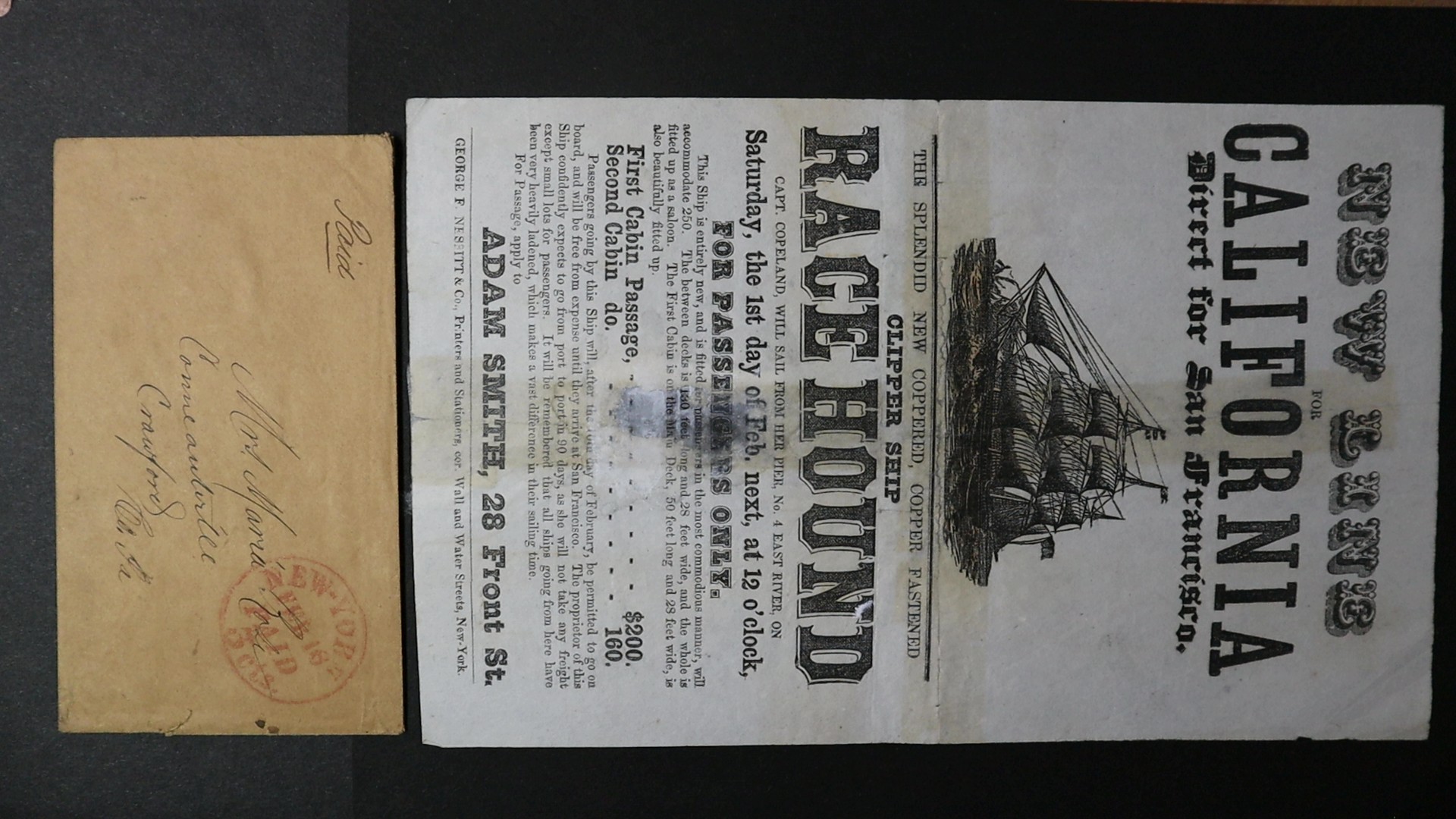 The San Francisco News Letter was published by Frederick Marriott and served to advance his intertwining financial and political interests, to level attacks against his foes, and to extort money from public figures who he threatened with the prospect of scandalous news reports. Each publication date was tied to an outbound Pacific Mail Steam Ship Company sailing to Panama and was sold by all Wells Fargo & Company agents throughout California. This issue Per Steamer Golden Age. Measures 9 1/4 X 11 3/8 inches and unfolds to 4 sections. Very rare lettersheet only 2 known.