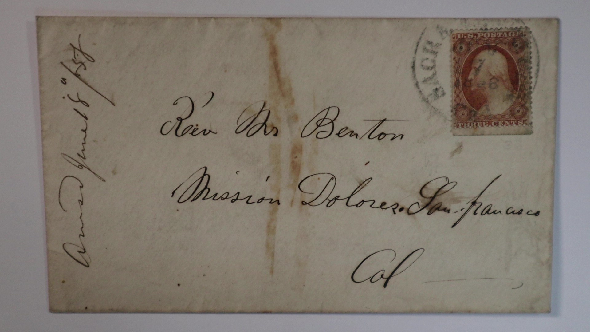 Click for larger image June 7 1858 Sacramento City 3c No.26 to Rev. Benton California Mission Dolores San Francisco Williams cancel type (SAC-2560) Cover good condition, stains at center.