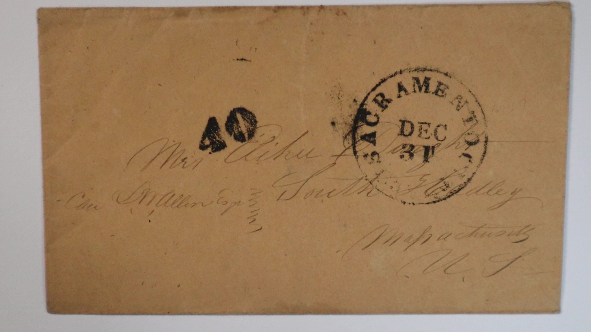 Click for larger image Dec. 31 Sacramento City California Small 40 sent to South Hadley Mass. Cover 1849-1850 great condition with wrinkles. (SAC-2520) Ex-Sampson