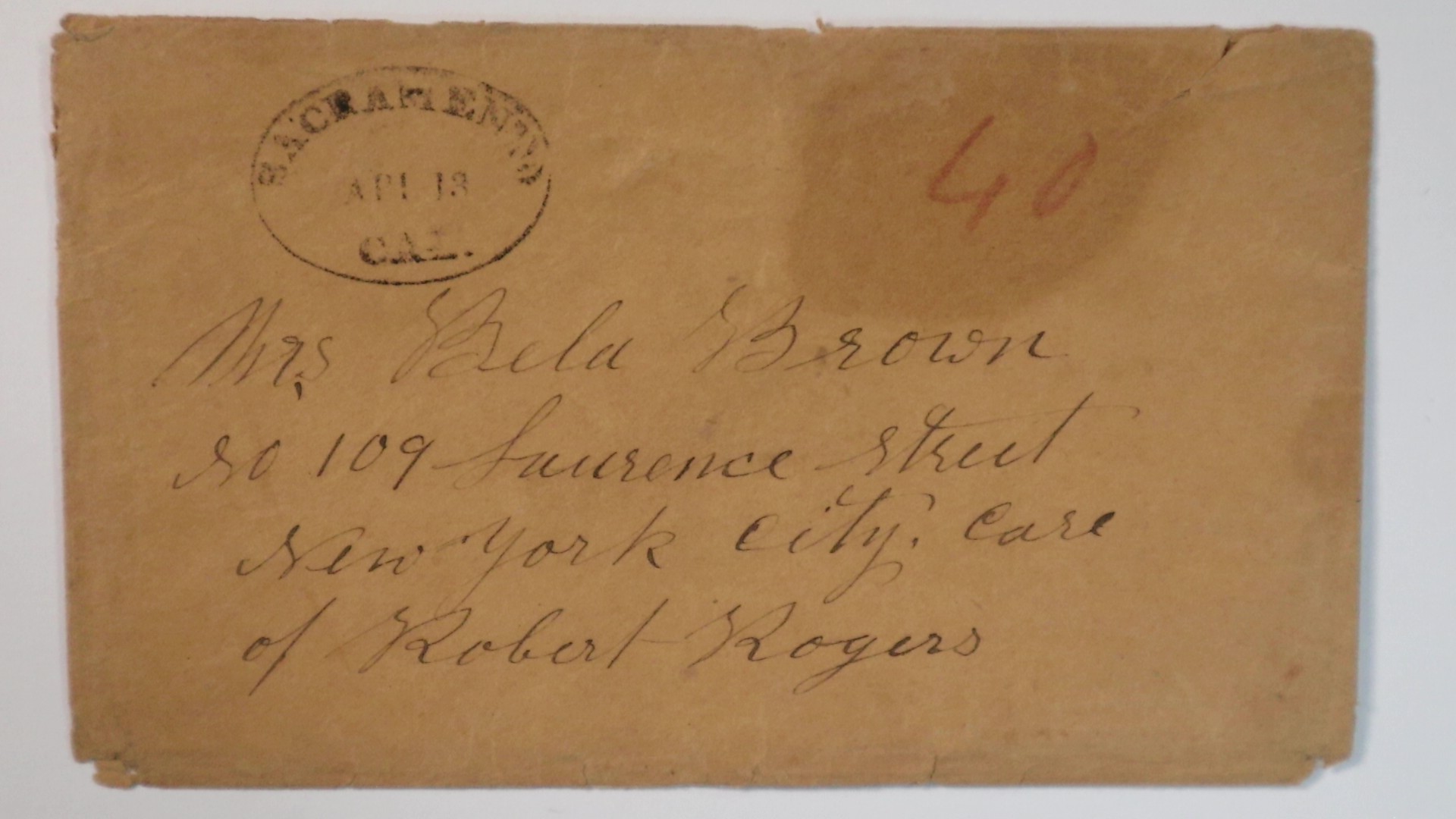 Click for larger image April 13 (1850) Pre-statehood Sacramento california 40 Manuscript in Red Cover to new York City Sacramento, Cal., Apr 13, (1850) oval date stamp (SAC-2480) on cover to Mrs. Bela Brown No. 109 Lawrence Street New York City , Care of Robert Rogers. Pre-statehood usage. Some wear at corners, stain at red 40.