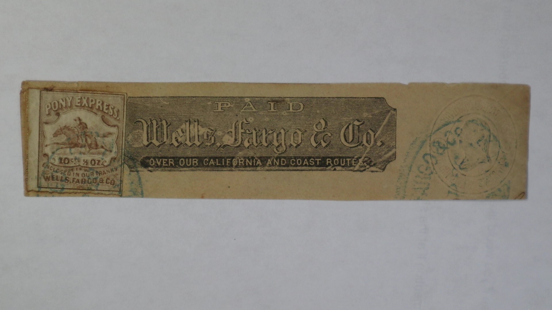 Click for larger image 10c Brown Virginina City Pony Express Stamp Tied on Wells Fargo Frank 3c Albino Indicia Piece 1862-64, 10c brown, left margin single with ample margins around, piece with blue company date stamps canceling and tying stamp, black company frank. Scott No. 143L7