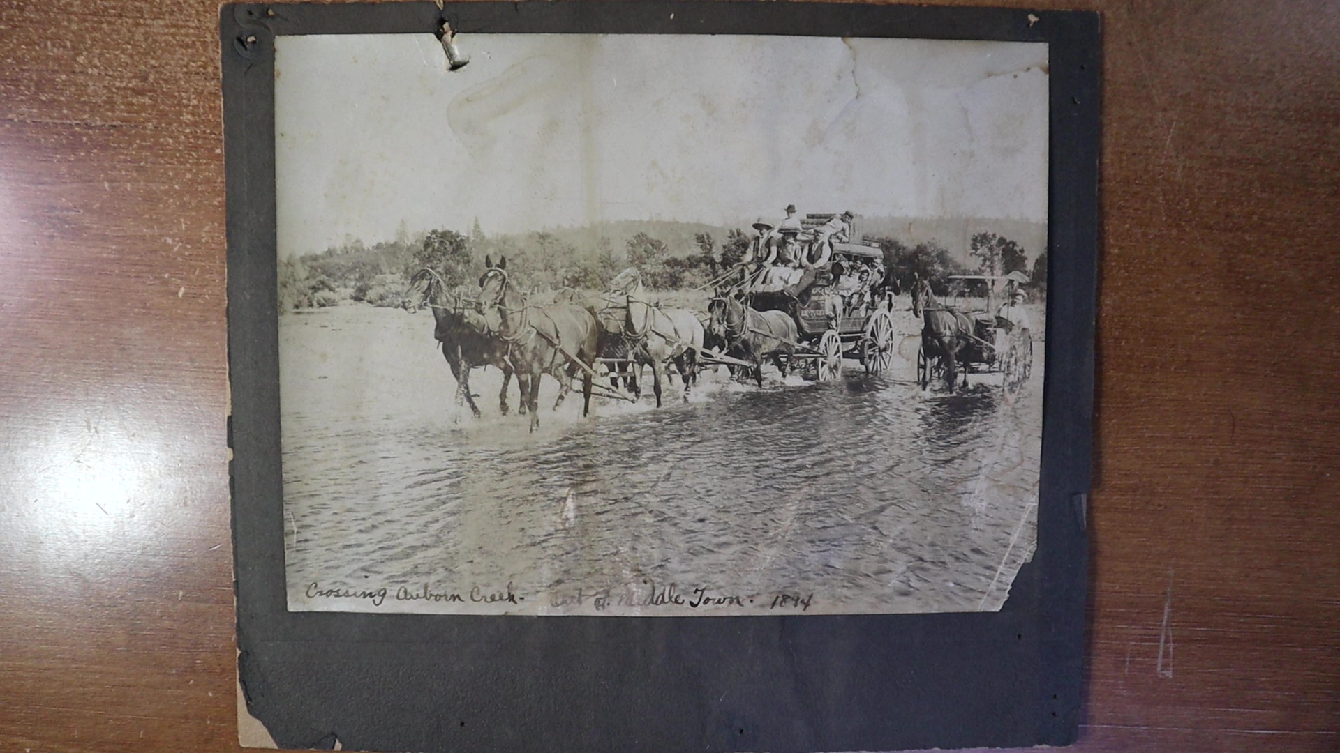 8 X 9 1/4 inch mount, nail holes, wear top mount, water stains and wrinkles to photo. Readable USM C & C.L. Stage Line W. Spiers Prop. Manuscript Crossing Auburn Creek Out at Middle Town 1894.