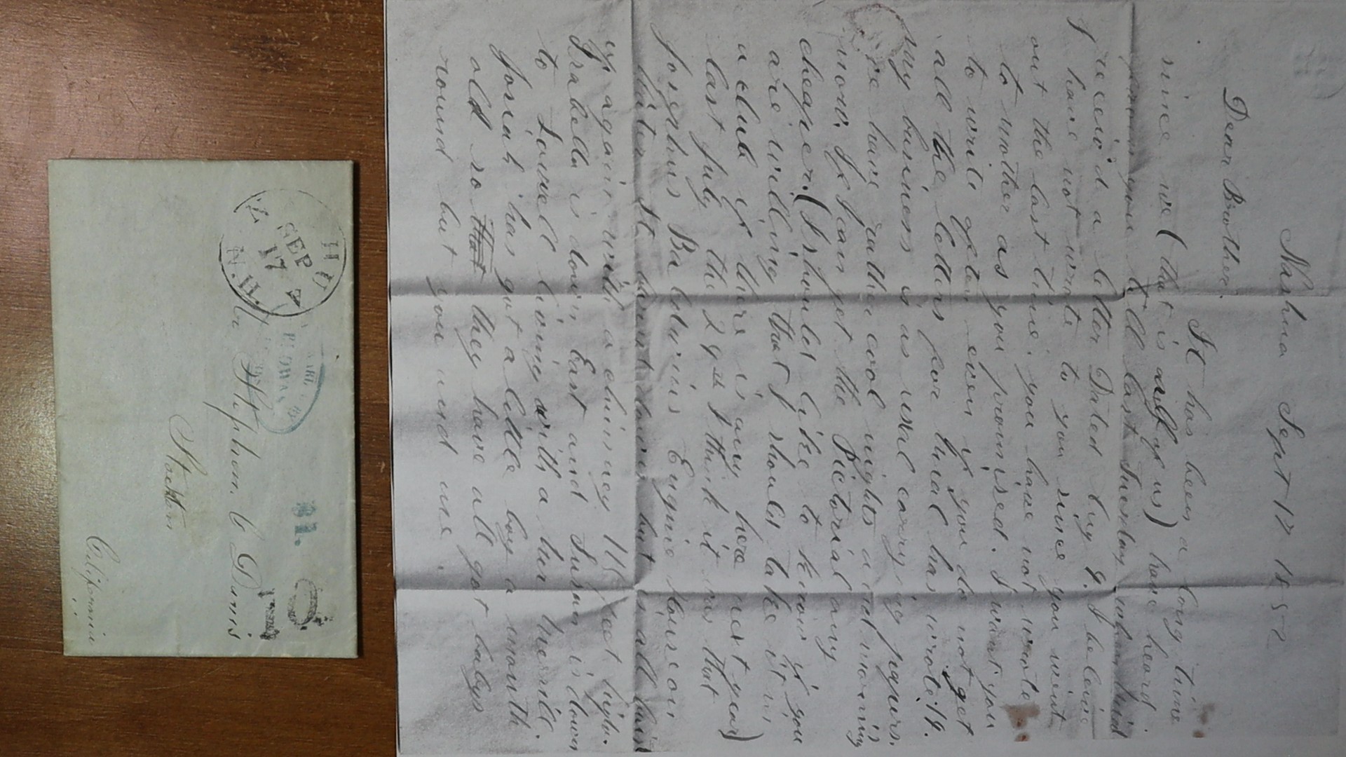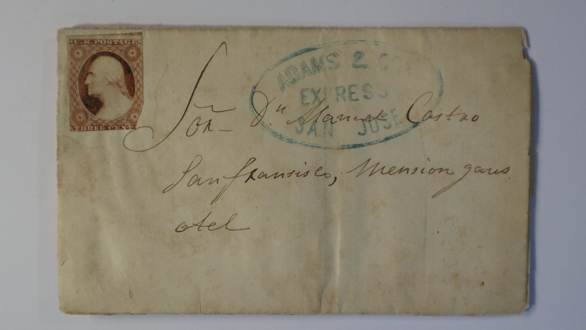 cover has black Nashua N.H. cds with 10 rate handstamp, struck large blue Browns/ Express/Stockton express co. handstamp (Thomas BRW-100) with matching blue $1. express rate handstamp (Thomas BRW-205b), lightly manuscript M C for carriage to Maxwells Creek, cover defects with wear and tears, short right corners, stamp hinges reinforced opening back flap. Stephen Chapin Davis and his brother, Josiah, journeyed to California in 1850, mining and keeping store at Long Bar, where they also ran an express between the Yuba River mining camps and Sacramento and San Francisco. Stephen later kept a store at Coulterville on Maxwells Creek. Never healthy enough to actively mine for gold, Stephen C. Davis died in 1856 at age 23. The Davis correspondence was ultimately found in the attic of a house in Nashua, New Hampshire which had long been vacated by Davis descendants, and most of it is now in the California State Library, Sacramento.