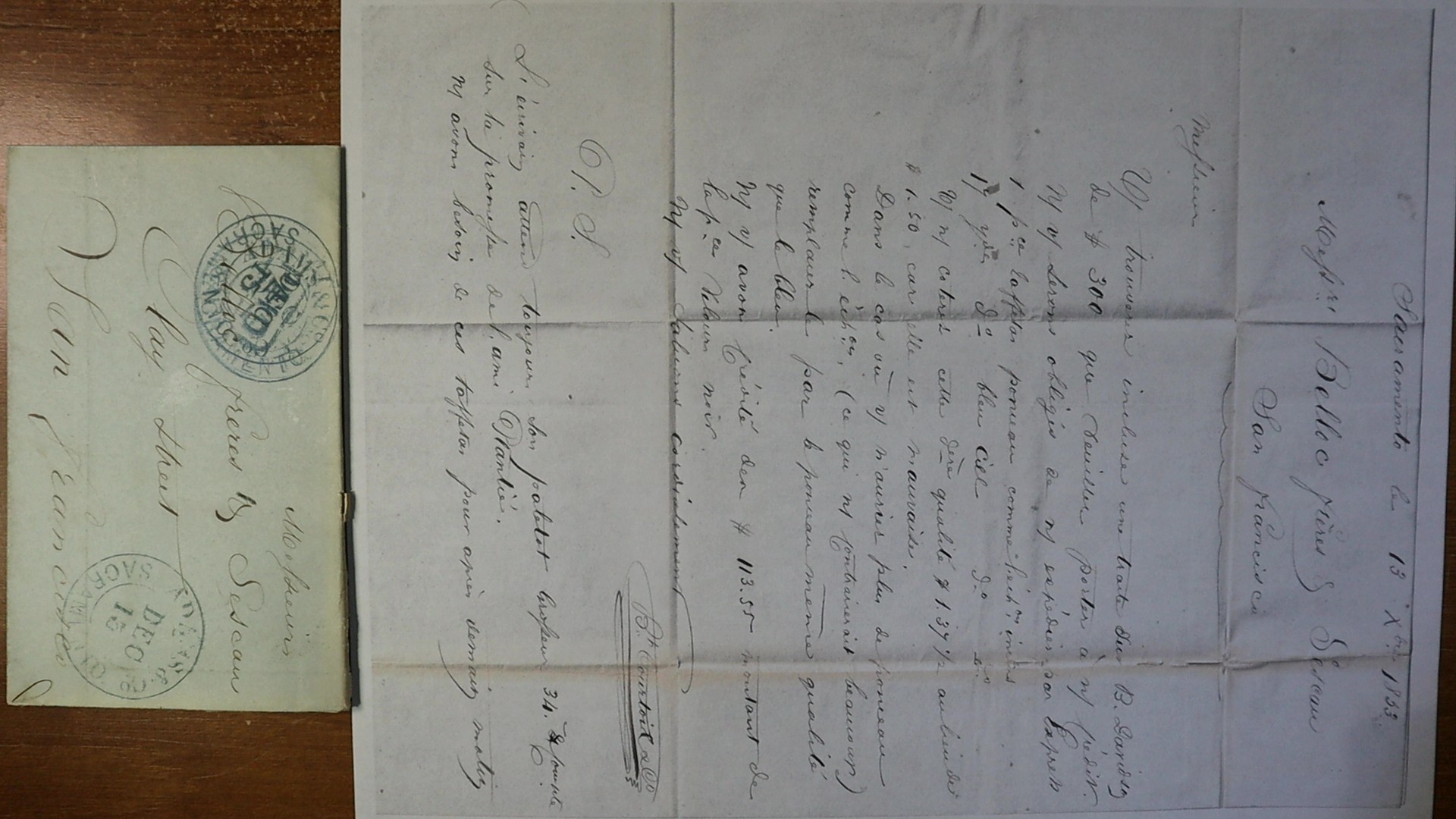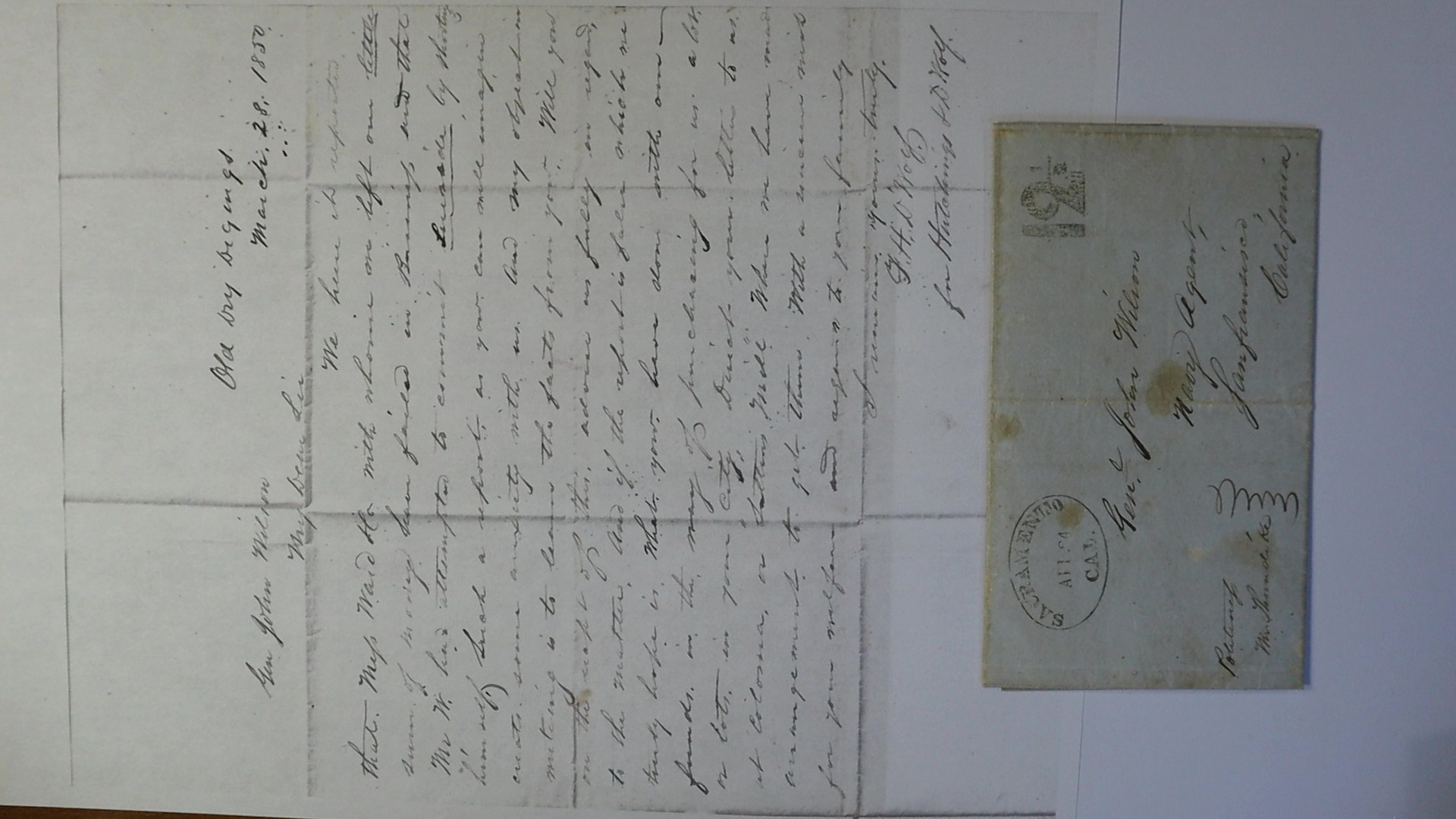 April 24 Sacramento oval postmark (SAC-2480) with tall 12 1/2c rate handstamp on folded one page letter to General John Wilson Navy Agent San Francisco with docket at left reads - Politeness Mr. Thorndike, We hear it reported that Mess. Waid & Co. with whom we left our little sum of money have failed in business and that Mr. W. had attempted to commit suicide by shooting himself. Direct your letter to us at Coloma of Sutters Mill where we have made arrangements to get them. Signed F.H.D Wolf for Hutchings and D Wolf .