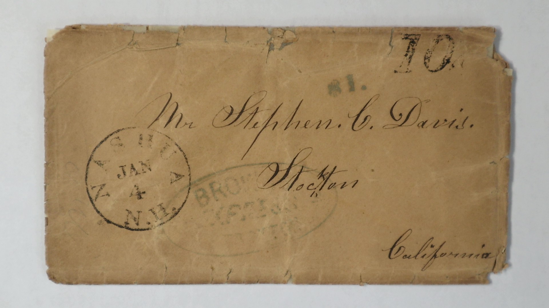 folded cover dated Nashua Sept 17, 1852 from brother George to Stephen in Stockton Cal., black Nashua N.H. cds and matching 10 rate handstamp, cancel in blue Forwarded By/Browns/ Express handstamp (Thomas BRW-101) and matching