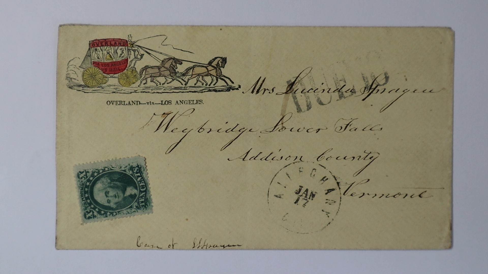 Overland Via Los Angeles Hand Colored 4 Horse Stage Coach Alleghany Sierra CA Due 10 Cover