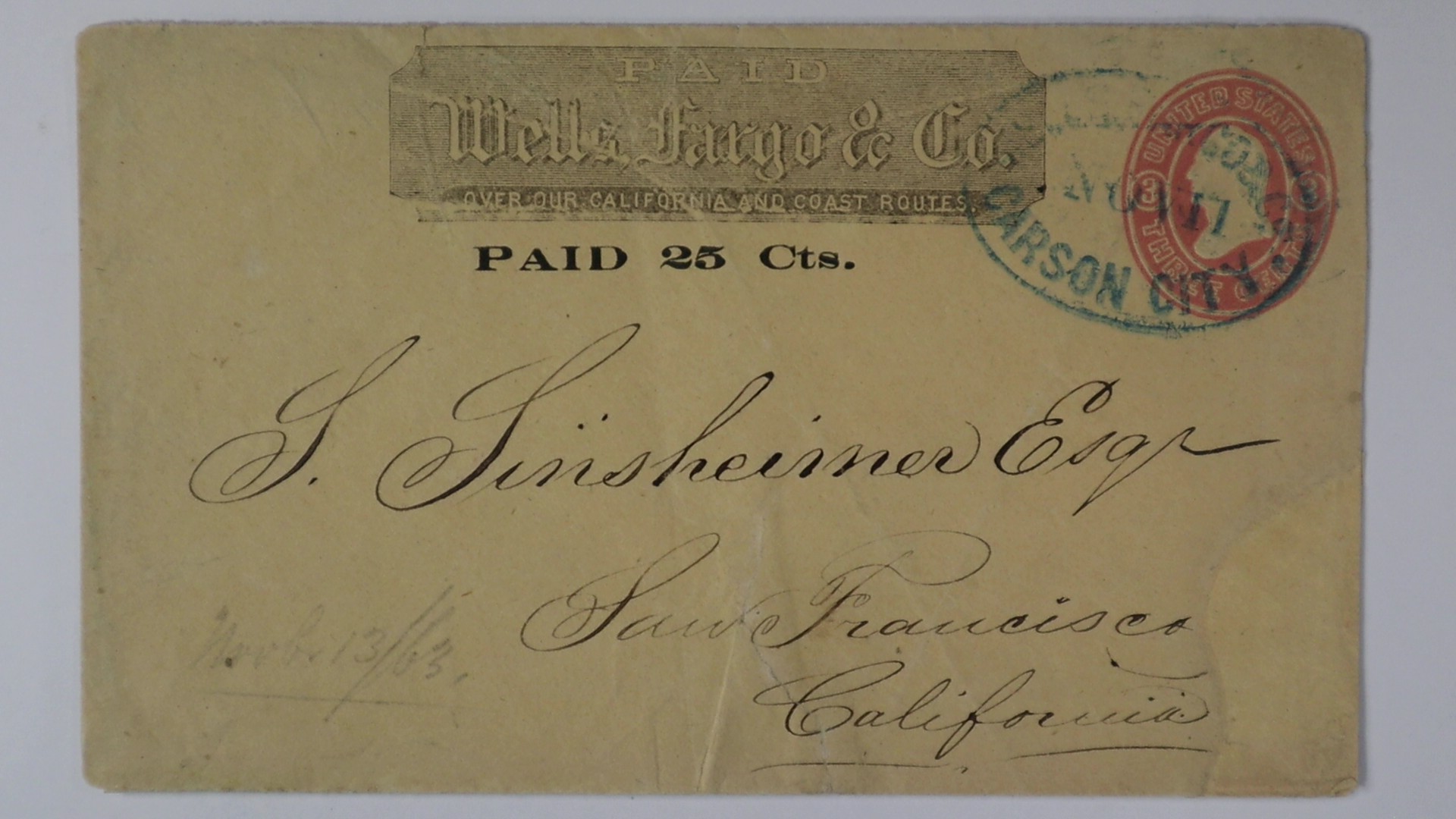 To S. Sinsheimer Esq. San Francisco California. Manuscript Docket at left Nov. 13/63. Condition wrinkles, paper repair from paper loss at lower right edge,closed tear at lower. INFO -- August 11 1862 to 1865. Wells Fargo & Company carried mail and news from Virginia City to Placerville. From Placerville via railroad to Sacramento then by boat to San Francisco. In addition to the adhesive Pony stamps, there were printed envelopes Paid 25 cts which was started in 1863. This was for Special Delivery and included Rapid Letter Service along the Pony Trail to San Francisco.