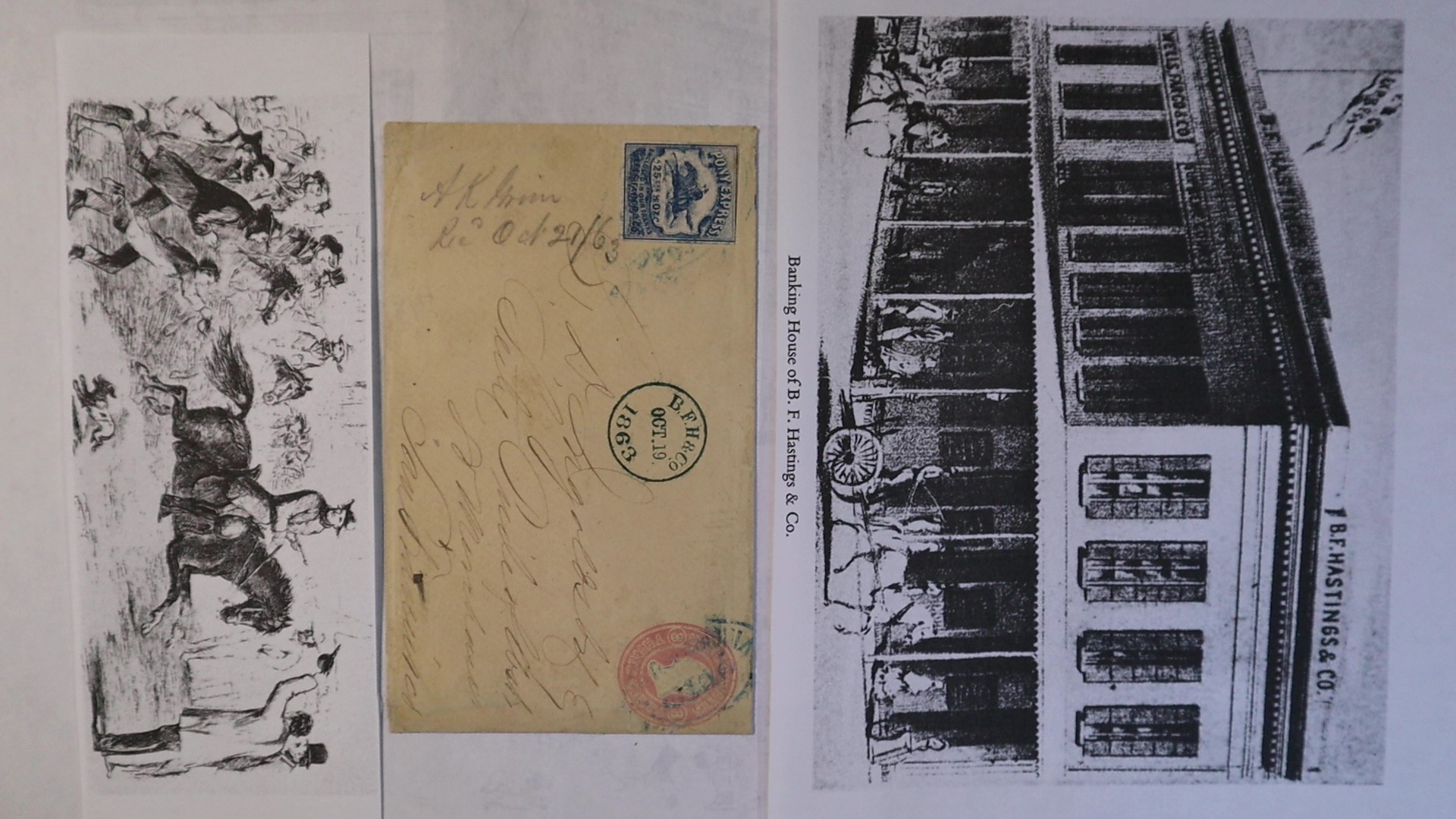 manuscript at left A.K. Gwin received Oct. 21/63 (1863) Wells, Fargo & Co. Virginia City, N.T., Oct. oval date stamp on 3c pink entire (U35) to San Francisco, with second strike canceling indicia, bold blue "B.F.H. & Co. Oct 19, 1863 company cds at center (B.H. Hastings & Co., bankers) used in lieu of express frank. The absence of the Wells Fargo frank on this entire is in accordance with a little known agreement between Wells Fargo and other banking institutions allowing them to transmit, via Wells Fargos express lines, envelopes displaying the banks handstamp in lieu of the Wells Fargo frank. B.H. Hastings briefly had a field office in Virginia City, therefore complying with this agreement. In Sacramento B. F. Hastings Building, which was the western terminus for the transcontinental Pony Express from 1860-1861. This cover during what is known as the Wells Fargo Virginia City Pony Express period going to and from the Comstock mining operations. Cover expert repaired at right. Ex Henry Clifford collection.
