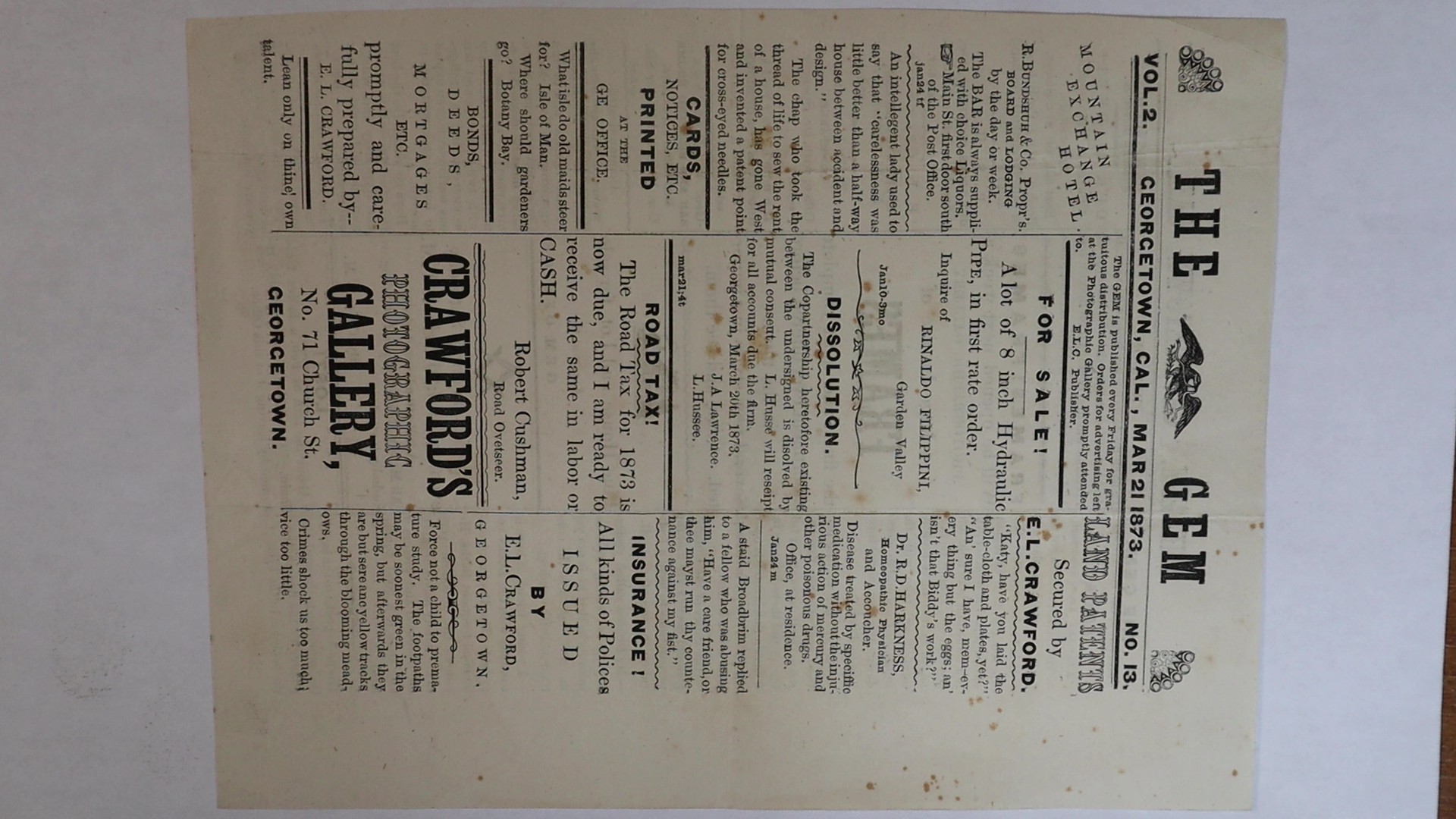 6x8 inch , printed at both sides The Gem newspaper Georgetown El Dorado county California advertising small circular By E.L. Crawford owner of The Gem newspaper and Photographic Gallery. Printed at back advertising picture Frames , House Lots Apply at Gem Office. Lost ladies GOLD Chain. The finder will be suitably rewarded by leaving it at this office. Georgetown business directory Our Market Curtis and Wentworth Proprietors - East side Main St. , E.L. Crawford Insurance Agent No.71 Church St. , T.F. Lewis Constable office with Dr. Spencer , Daniel Jerrett Groceries and Provisions , Geo. W. Parsons Bar and Billard Rooms - Best Wines and Liquors Corner Main and Placer Sts. Crawford also ran and express company in El Dorado County early on from 1855 to at least 1859 known as Crafords Middle Fork Express.