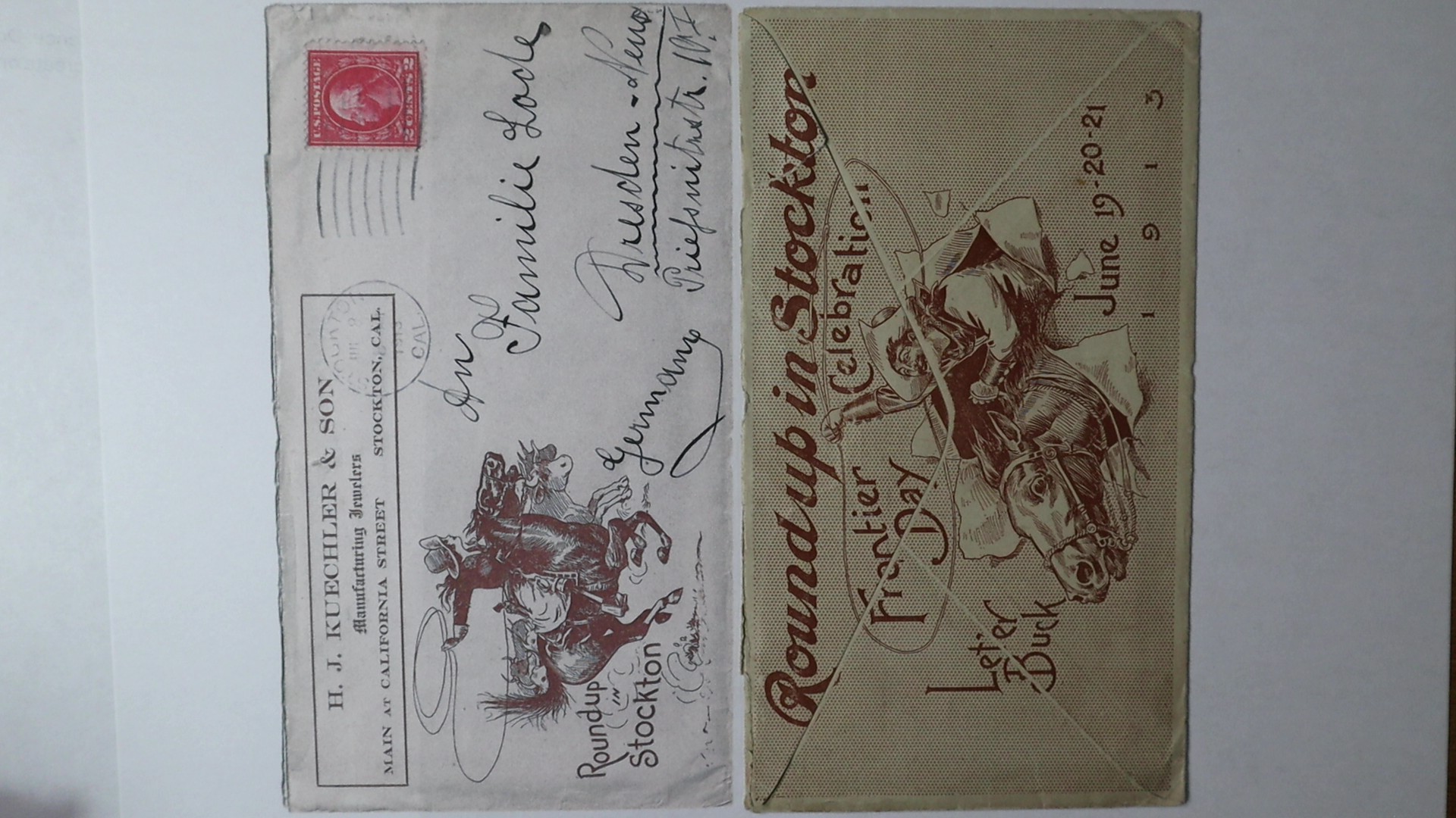 1913 Stockton CA Roundup Frontier Day Celebration Cow Girl Boy 2c Red to Dresden Germany Cover