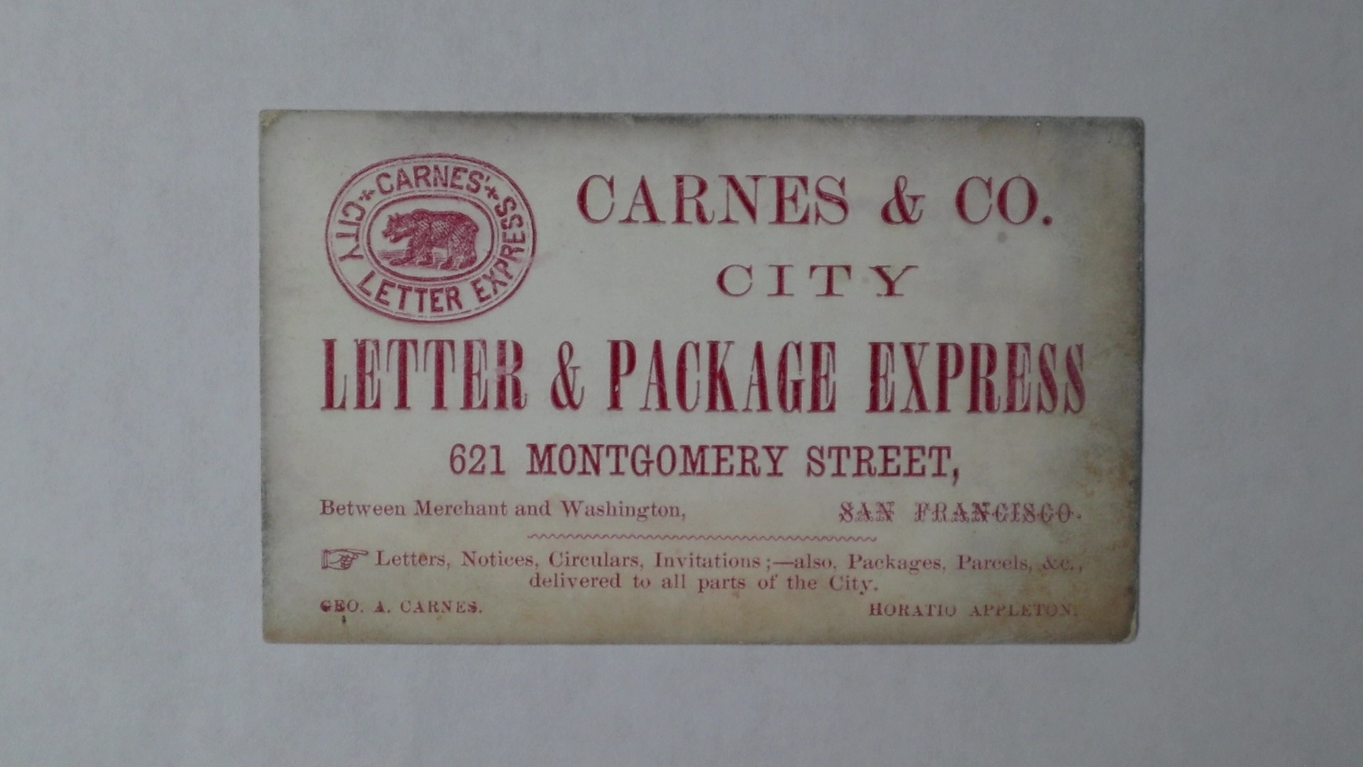 of Geo. A. Carnes and Horatio Appleton - 621 Montgomery Street Between Merchant and Washington. Letters , Notices , Circulars , Invitations - also Package and Parcels delivered to all parts of the City. Measures 2 1/8 X 3 1/2 inches printed on glazed coated paper. Some light toning at edges.