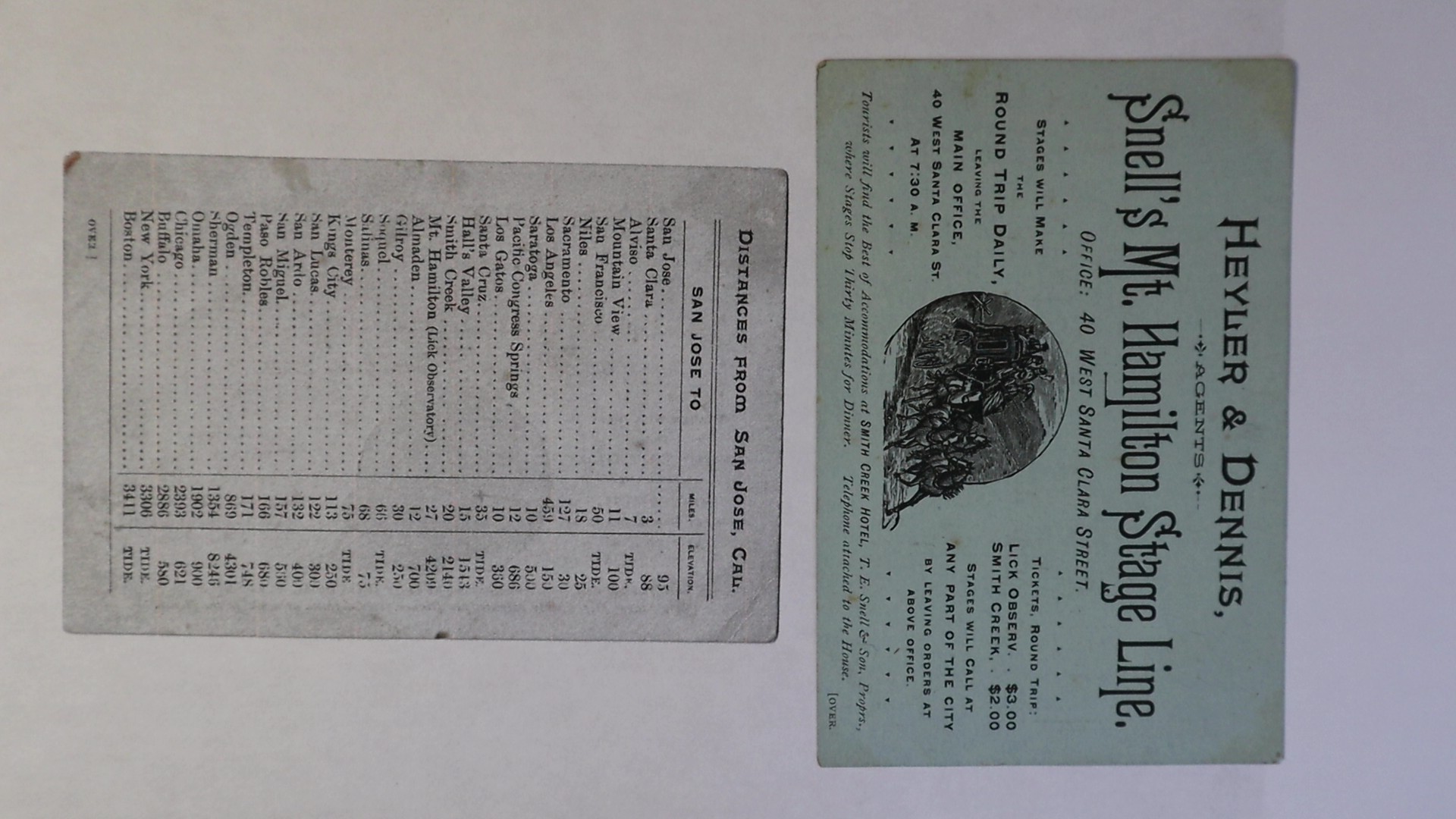 ,3 1/8 X 5 1/5 inch advertising Heyler and Dennis Agents office at 40 West Santa Clara Street, tickets round trip Lick Observatory 3 dollars , Smith Creek 2 dollars. Smith Creek stage stop located on the Mount Hamilton road or Lick Ave. leading to the Lick observatory , smith Creek Hotel was also known as The Santa Ysabel Hotel.