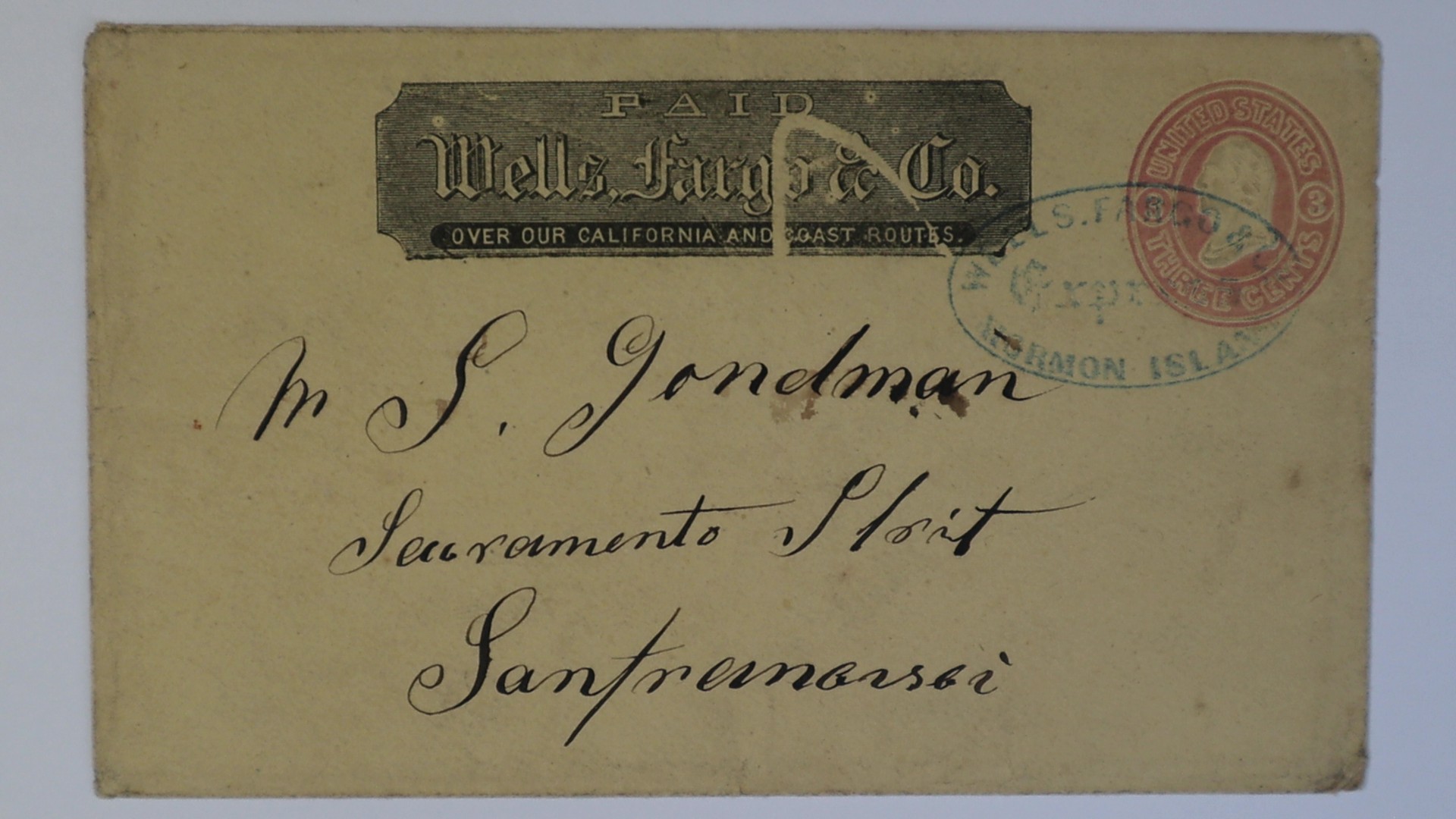 clear light blue oval handstamp (Leutzinger 03-01) with printed Wells Fargo frank on 3c pink (U35) buff entire to San Francisco Cal. some wear at corners ex-Leutzinger.