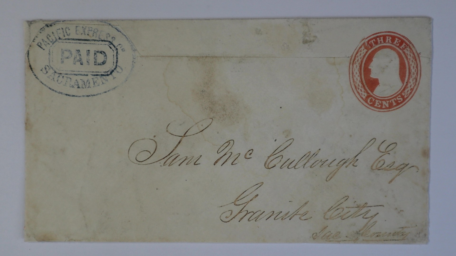 Granite City later known as Folsom City. Pacific Express Co. Sacramento, small blue company oval handstamp with matching boxed PAID (Thomas PAC-120) struck in center of oval to constitute a prepaid franked envelope on 3c red (U9) Nesbitt entire to Granite City, Sac. County, Cal., edge and corner wear, top portion of cover replaced up to handstamp and indicia. This provisional frank was prior to Pacific Express production of their own printed franks, undoubtedly shortly after their formation in March 1855 after the demise of Adams & Co.