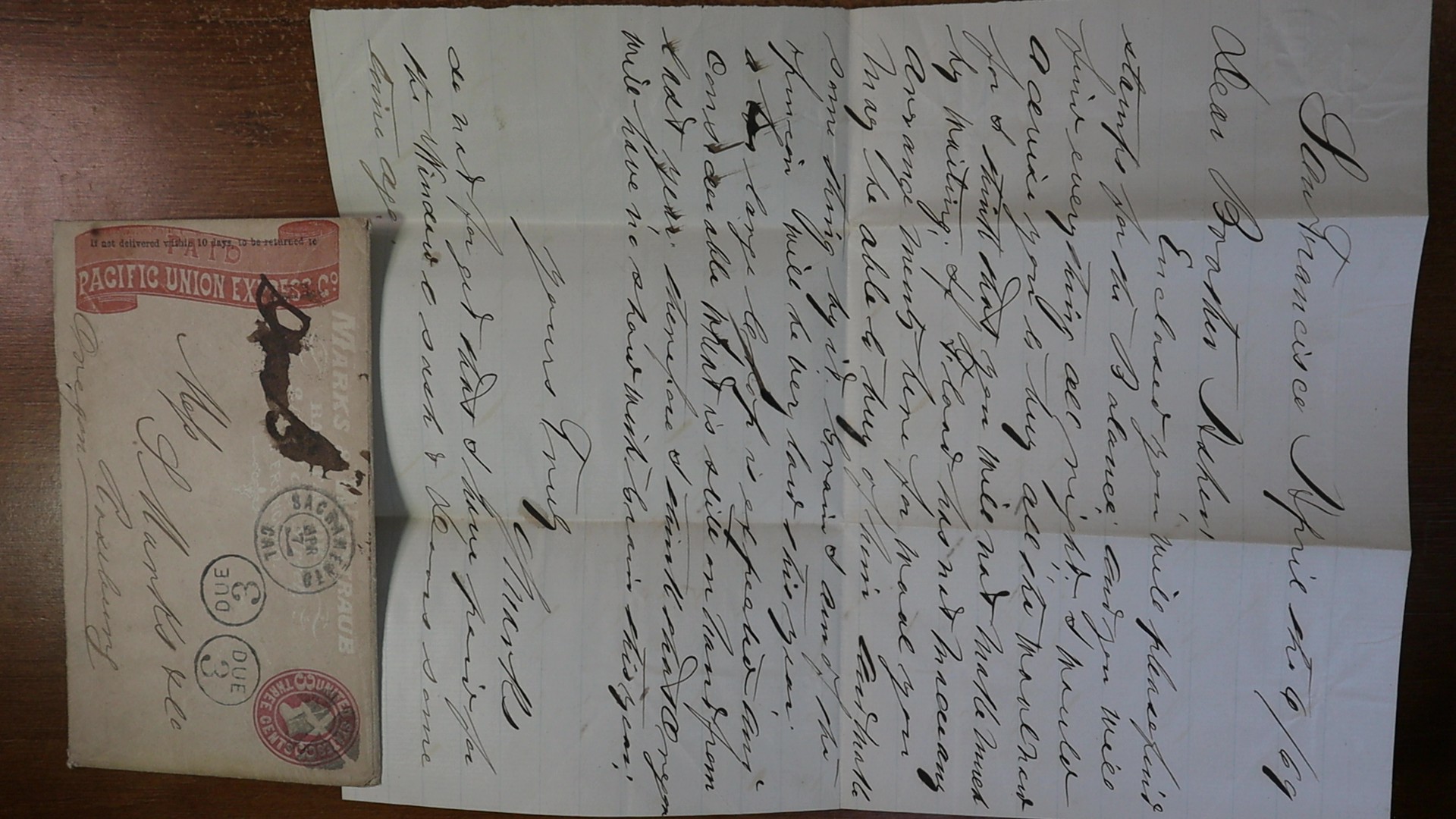 one page letter signed by Marks, letter to brother Asher Roseburg Oregon. Marks & Weintraub, San Francisco, with Pacific Union Express red ribbon printed frank vertically at left (Thomas PAU-001a) on 1864-65 issue 3c pink on buff entire (U59) to Roseburg, Oregon, entered mails with Sacramento Cal. Apr 7 (1869) cds with two strikes of Due 3 in circle, overall shaded ad cover for Marks & Weintraub, messy ink Due 3 manuscript on cover with original letter to brother datelined San Francisco April the 6/69. Cover opened at bottom edge.