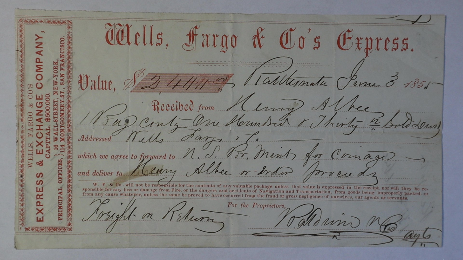1855 Rattlesnake California Wells Fargo Express 1 Bag Ore to US Mint for Coinage Receipt