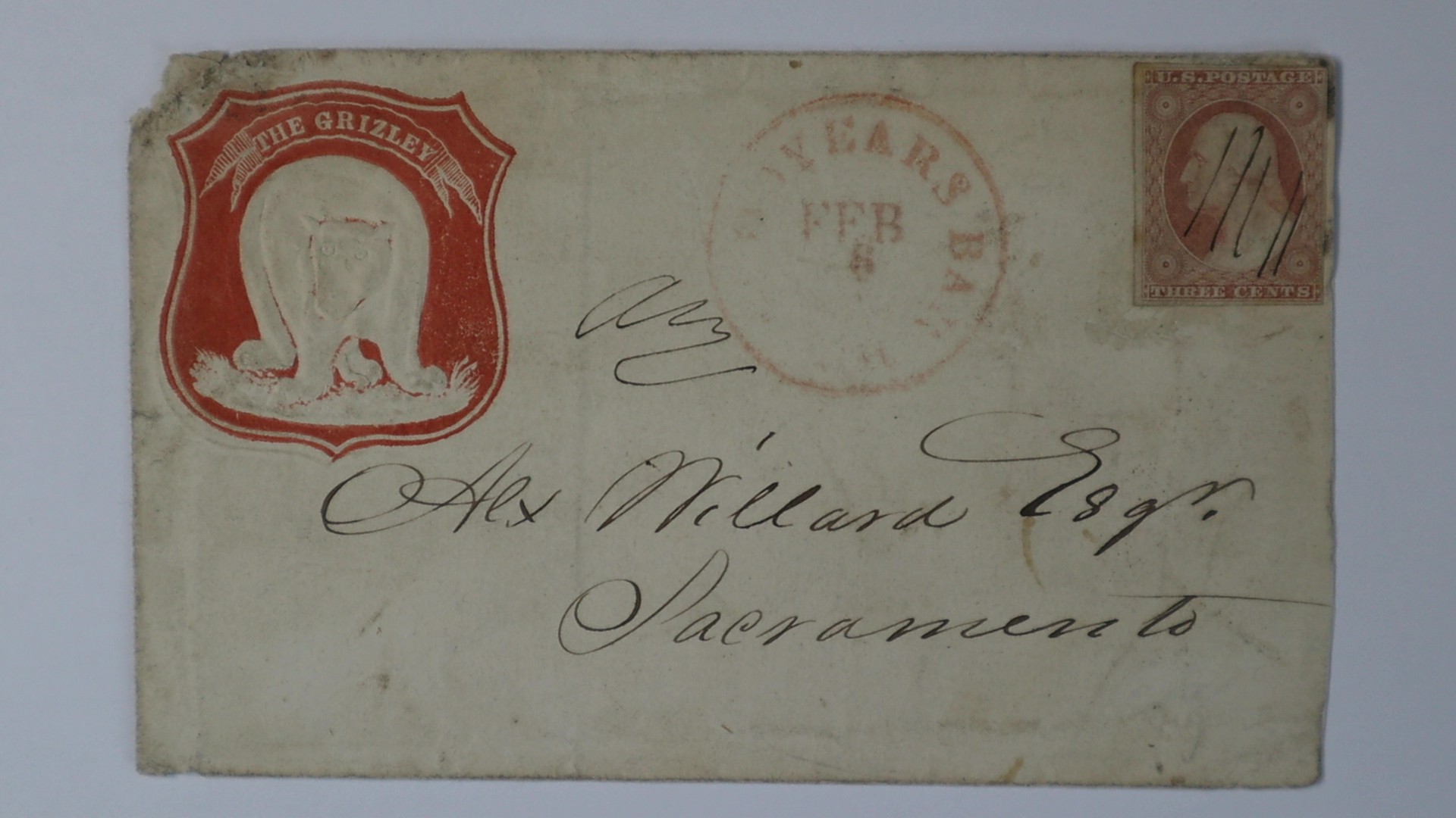 addressed to Alex Willard Esq. Sacramento ,Cameo titled The Grizley. Embossed red cameo design on cover franked with 1851 3 cent dull red with pen cancels, postmarked red Goodyears Bar, Cal, Feb 6 cds addressed to Sacramento, minor deterioration at upper left and reduced at right, This is the only known example, this cover is illustrated in Coburns Letters of Gold (page 232). The grizzly bear is the official California state animal and is featured on the California State Flag, which was adopted in 1911. The grizzly bear first appeared on the banner raised over Sonoma during the Bear Flag Revolt against Mexican rule in June of 1846