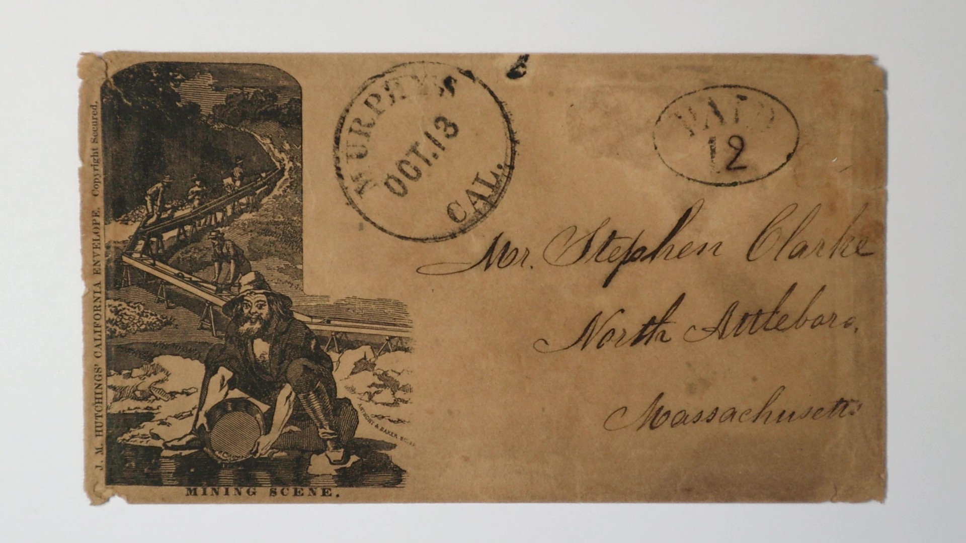 to North Attleboro Mass. Mining Scene depicting Miner Panning for Gold with Long Tom in the background. Anthony & Baker SC engravers imprint at bottom of design. addressed to Mr. Stephen Clarke North Attleboro Massachusetts , some wear and minor faults.
