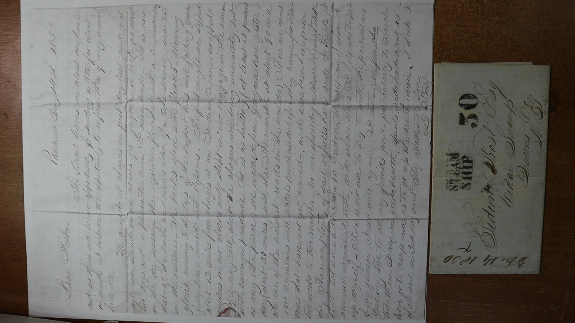 letter reads in part, The mail leaves in about an hour and as there will be no opportunity of sending a letter for about a month I embrace the opportunity to inform thee of my arrival here. We arrived at Chagres on first day last and that afternoon started in our canoes for Gorgora. It took us about two days and a pleasanter time I never had…The first night we stopped about 12 miles from Chagres at an Indian Town wrapped ourselves in our cloaks and slept on our baggage in the canoe People may talk about the Chagres never being unhealthy but with common prudence (It is as healthy at least at present as any other place) we walked from Gorgona here yesterday (about 30 miles) with the thermometer at about 90 and over one of the hardest roads in the world. There are about 1500 Americans with tickets purchased before they came for steamers that have not yet arrived, and have been here from two weeks to two months…I think I shall take the Bark John B. Gardner. L. Frost