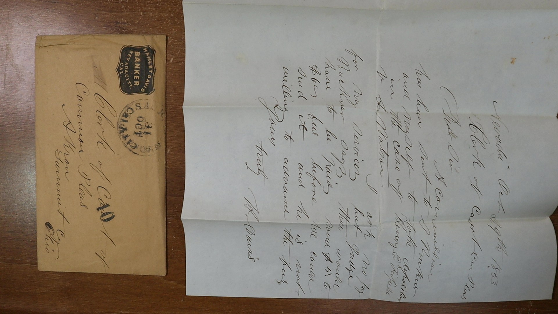 condition with wrinkles at left edge, One page letter enclosed dated lined Nevada City Oct. 29th 1853, letter signed H. Davis. - Some History - 1851 Hamlet Davis Nevada Citys first directly elected mayor, election was voided when the initial city incorporation was vetoed by Governor John McDougal. Hamlet Davis was a merchant, banker, express agent, theater operator, and more. In 1857 he moved to Dutch Flat and became a farmer, then, in 1868, opened a grocery store in Truckee. Twenty years later, Davis left Nevada County and settled in Kentucky, where he lived until his death in 1900. Hamlet Davis building was located on Broad Street near Pine. A Rare Gold Rush Banker cameo advertising cover and letter.