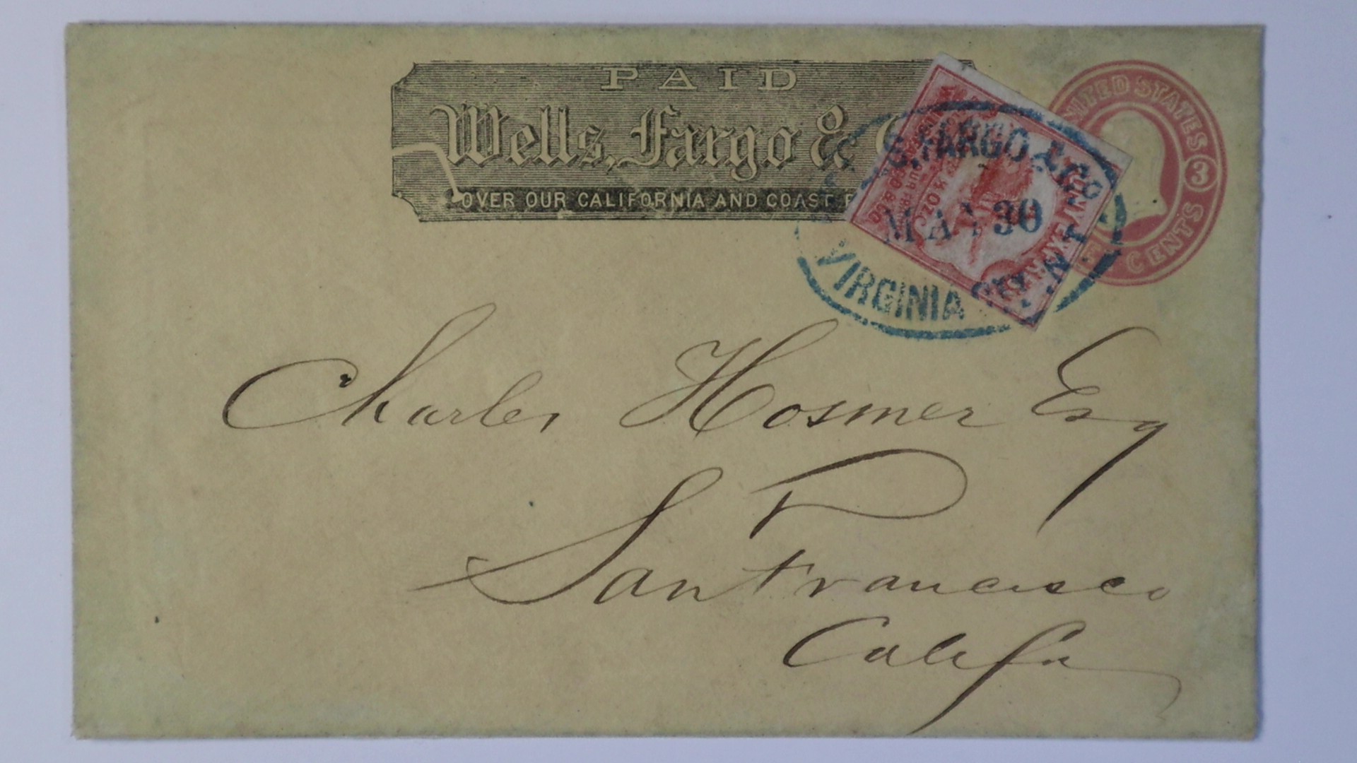 manuscript at left A.K. Gwin received Oct. 21/63 (1863) Wells, Fargo & Co. Virginia City, N.T., Oct. oval date stamp on 3c pink entire (U35) to San Francisco, with second strike canceling indicia, bold blue "B.F.H. & Co. Oct 19, 1863 company cds at center (B.H. Hastings & Co., bankers) used in lieu of express frank. The absence of the Wells Fargo frank on this entire is in accordance with a little known agreement between Wells Fargo and other banking institutions allowing them to transmit, via Wells Fargos express lines, envelopes displaying the banks handstamp in lieu of the Wells Fargo frank. B.H. Hastings briefly had a field office in Virginia City, therefore complying with this agreement. In Sacramento B. F. Hastings Building, which was the western terminus for the transcontinental Pony Express from 1860-1861. This cover during what is known as the Wells Fargo Virginia City Pony Express period going to and from the Comstock mining operations. Cover expert repaired at right. Ex Henry Clifford collection.